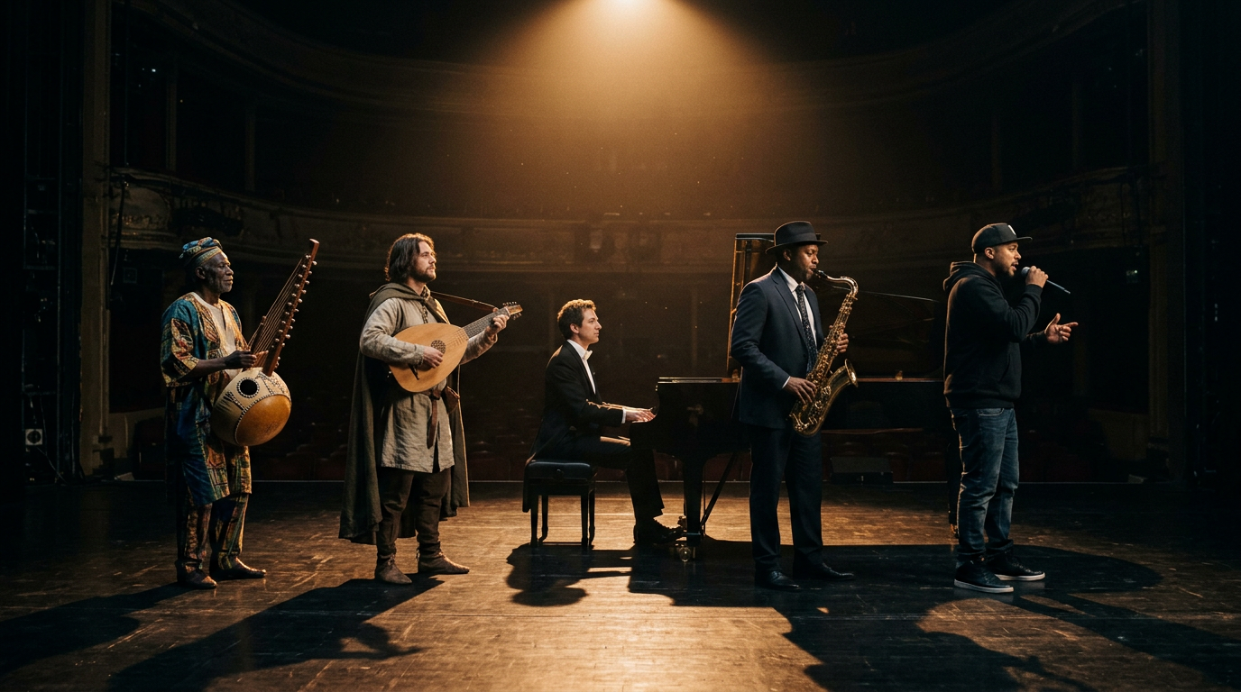 De la polyphonie médiévale aux cathédrales gothiques, du baroque flamboyant de Bach et Vivaldi au romantisme passionné de Chopin et Beethoven, des griots d’Afrique de l’Ouest aux maîtres du flamenco espagnol — chaque épisode ouvre une nouvelle fenêtre sur une époque, une culture, un son. La série parcourt sans frontières le gospel et le blues des plantations américaines, le jazz des clubs de La Nouvelle-Orléans, la soul de Detroit, le reggae de Kingston, le hip-hop du Bronx, la musique électronique des dancefloors de Chicago et de Berlin, jusqu’aux Afrobeats de Lagos et à la K-pop de Séoul. Un panorama sonore total, où chaque style révèle ses racines, ses influences et l’humanité qui l’a fait naître.